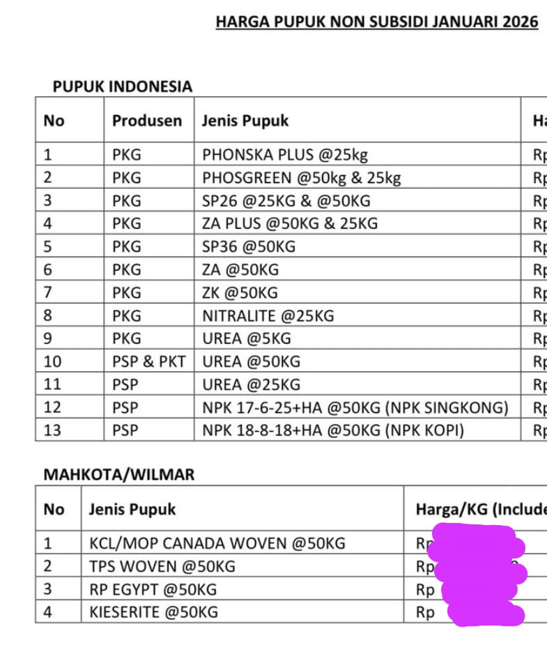 Untuk tahun 2026, harga pupuk SP-26 “Petro” yang kami tawarkan berkisar antara Rp 85.000 – Rp 110.000 per karung 50 kg, tergantung beberapa faktor: